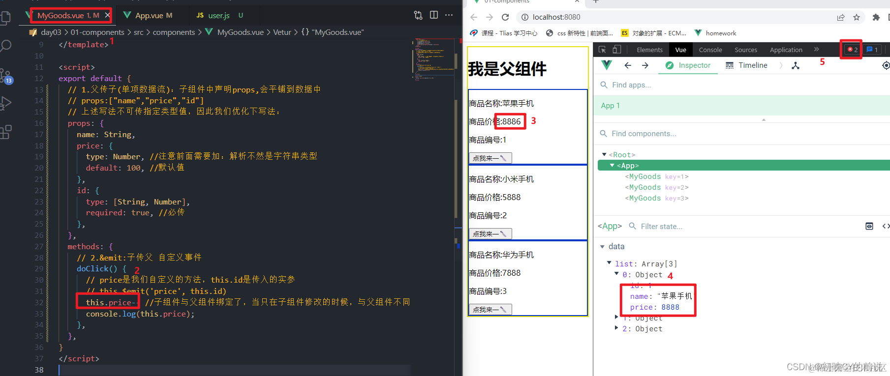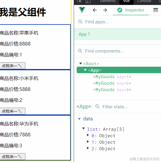可以看到我们的传值是完全OK的,父组件App.vue里面的数据与我们子文件MyGoods里面的数据是一摸一样的。可得知这两者数据相同并且得到了修改。