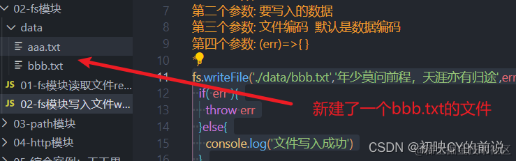 fs.writeFile('./data/bbb.txt','年少莫问前程,天涯亦有归途',err=>{