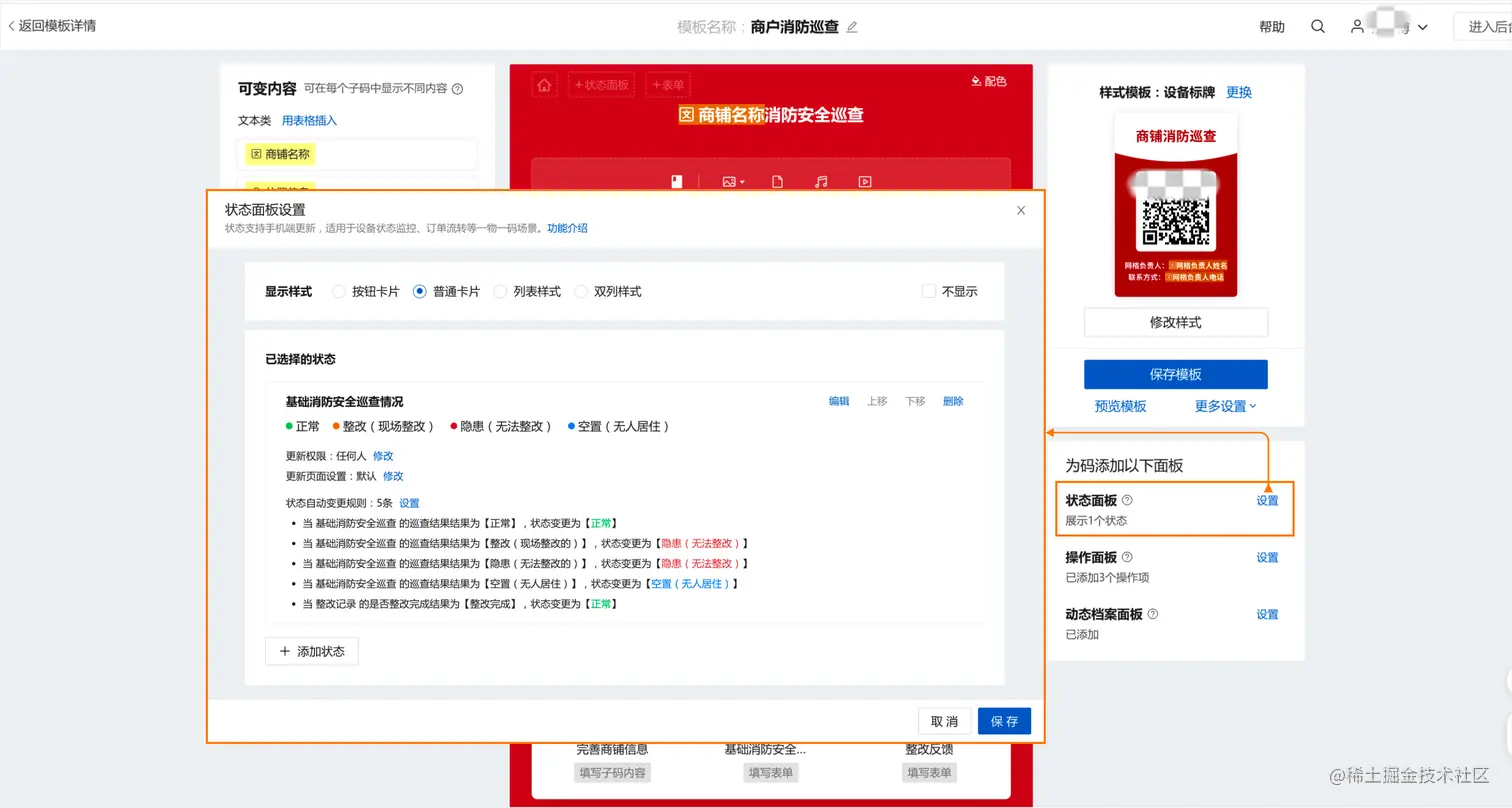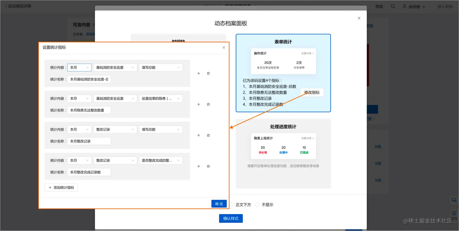 对于动态档案面板进行设置,选择表单统计样式,来统计巡查和整改记录情况, 可设置想要统计的指标,直接展示在二维码上。