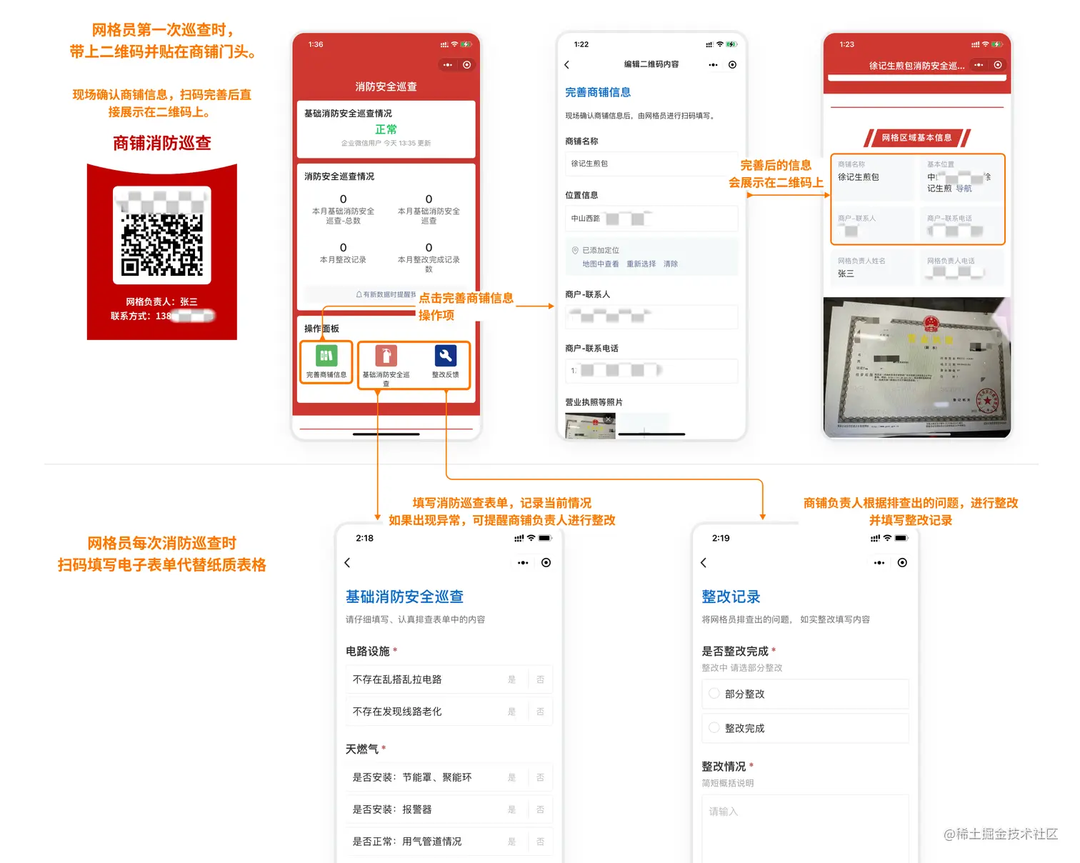 4.网格员去做消防巡查时,可扫码填写“消防巡查表单”,记录当前巡查情况,并自动更新当前状态。如出现异常情况,可提醒商铺负责人进行整改;