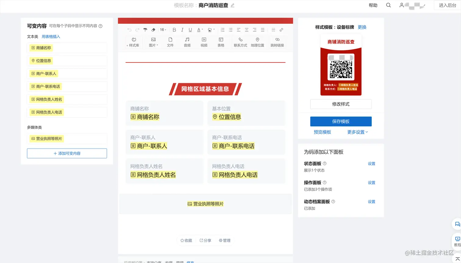 在草料二维码的模板库中找到对应的商户消防巡查模板,套用后修改批量模板。也可以新建批量模板,根据实际需求进行自定义。插入可变内容,包含:商铺基本信息、负责网格员的信息等。