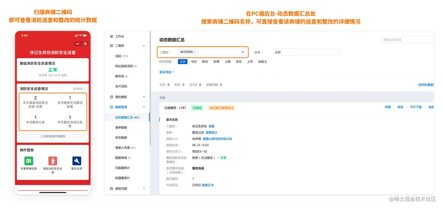● 也可在PC端后台-动态数据汇总处,搜索商铺二维码名称,直接查看该商铺的巡检和整改的详细情况。