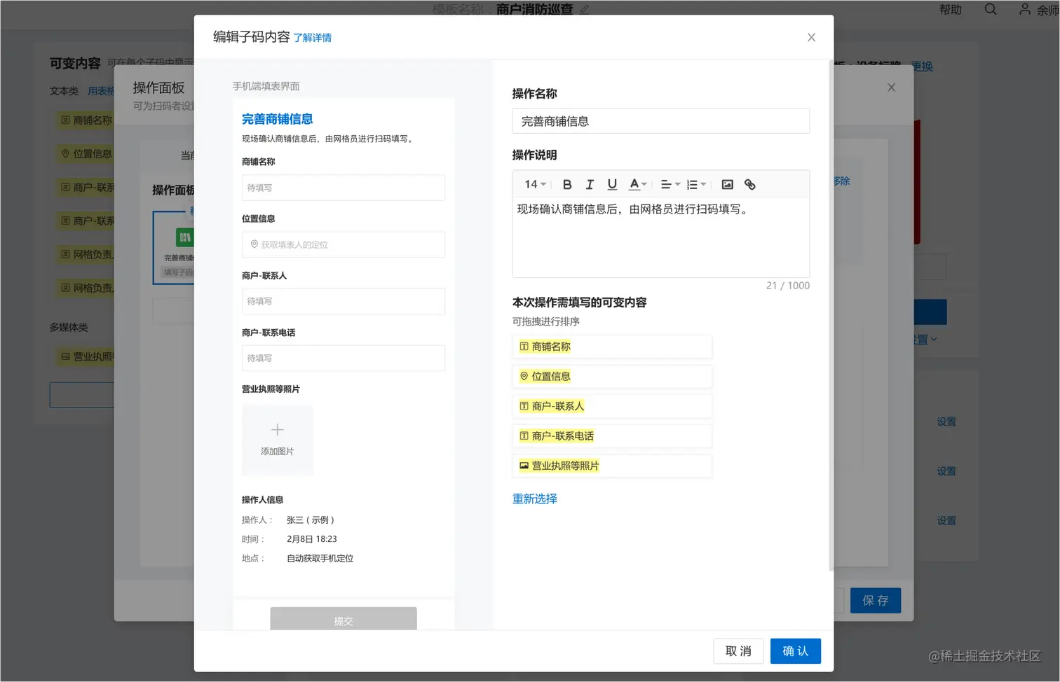 因此可添加“填写子码内容”操作项,包含需要完善的商铺信息的可变内容。现场确认商铺信息后,网格员扫码进行填写,直接展示在二维码上。后续如果商铺信息有变更,可直接扫码更新。