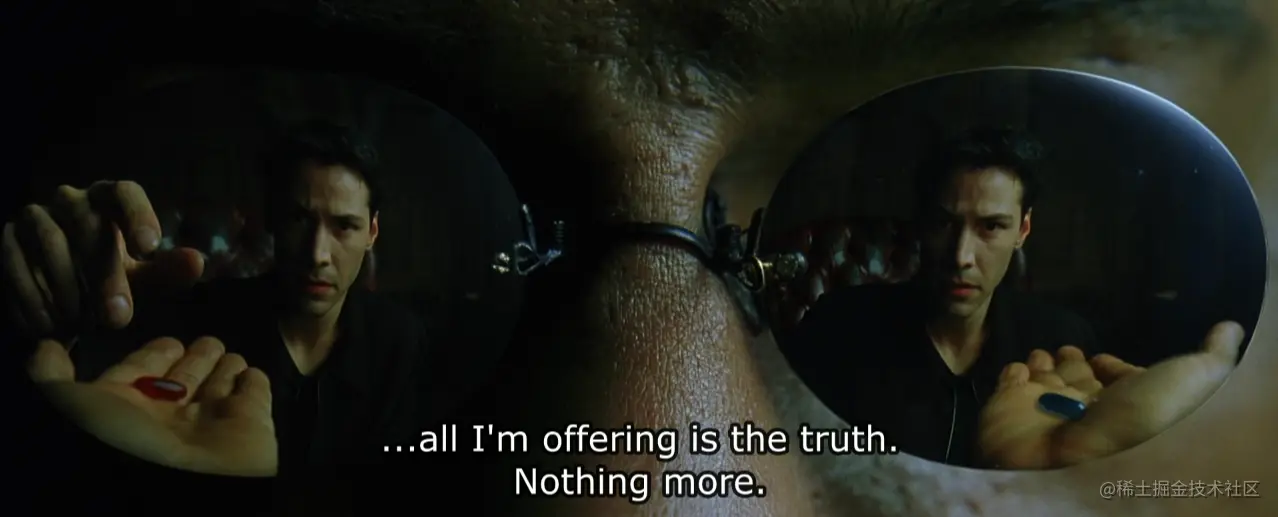 电影中的经典一幕是让 Neo 作出选择,选红药丸还是蓝药丸。