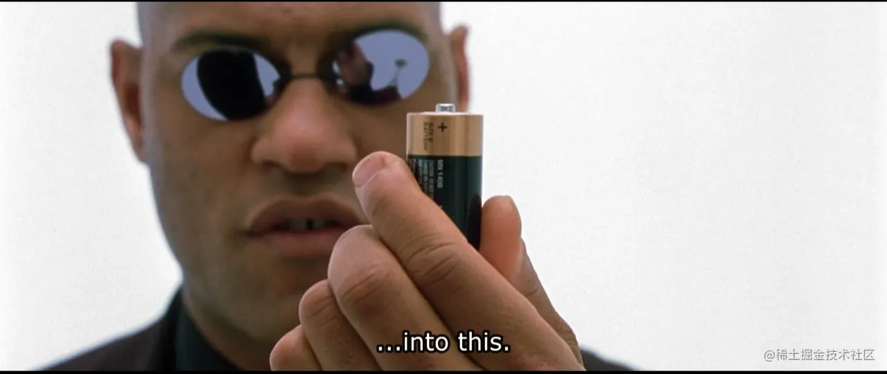 为什么我会觉得不懂程序看《黑客》会比较费力呢? 因为整个故事的内涵,从背景到环境到人物角色甚至道具都使用了程序来作比喻。 我们先简单回顾下故事背景,某天,一个有意识的程序诞生了,并繁衍了整个人工智能的机器种族。 后来人类和人工智能机器爆发了战争,人类选择遮蔽天空切断机器的能量来源。 而聪明的人工智能机器发现可以利用人体大脑的生物电和身体热量通过一种特殊形式的聚变融合反应来提供源源不断的能源。 所以,机器就开始大量养殖人类,将人类变成了机器能源的供应者,电影里用电池作了个比喻。