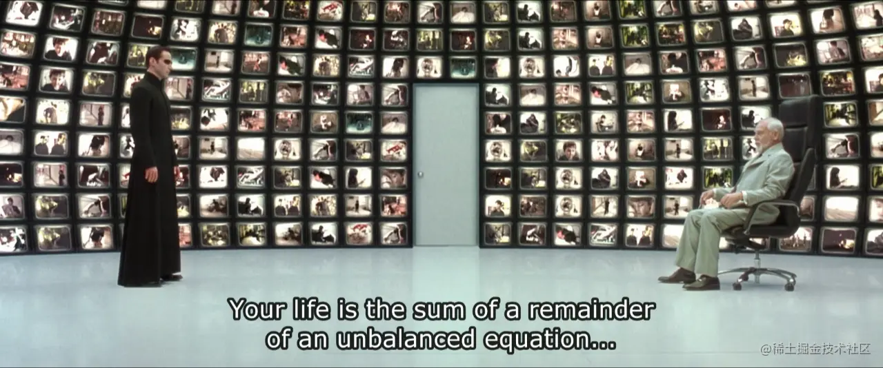 机器一开始创造了一个完美的 Matrix 空间,是一个毫无生活压力并实现了共产主义的乌托邦。 但人类天生的基因缺陷导致它们无法在这样的乌托邦中长久生存,很快出现大批量的死亡。 所以机器重新模拟了一个基于 1999 年真实人类社会现状的虚拟空间,在这里人类可以长久的存活下去,而当时实际的年代是 2199 年。 故事背景就交代到这里,再这么写下去就变成影片简介了。 下面我会站在程序背景的角度来提出一些设问并作答,如果你发现答案和你当初理解的不一致,不妨再重温一遍电影。