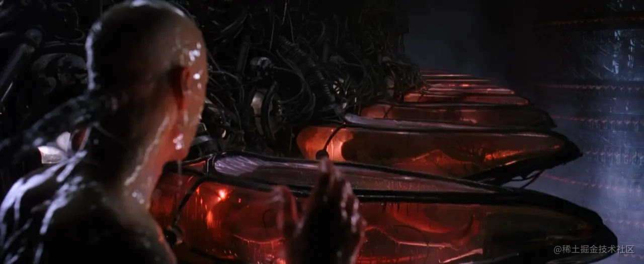 在《黑客》里人类的真实生存现状是下面这样的,身体生活在黏糊糊的营养液中,而思想则生活在 Matrix 中,一个虚拟现实空间。