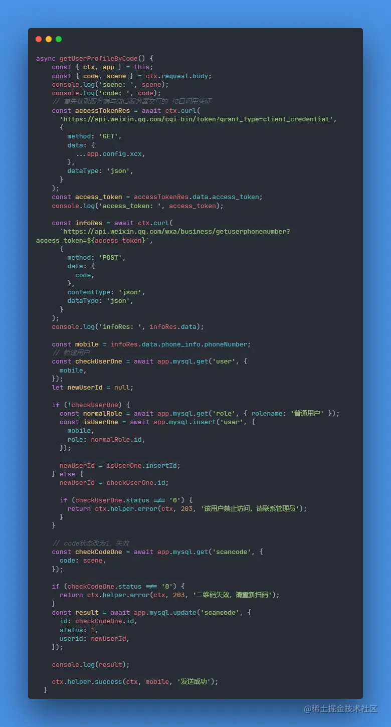 - 后端接收到用户信息后,判断用户是否已经注册,如果已经注册,则直接登录,如果没有注册,则将用户信息 openid 和 mobile 保存到数据库中,新建用户,生成一个 token,返回给 PC 端,展示用户登录成功。