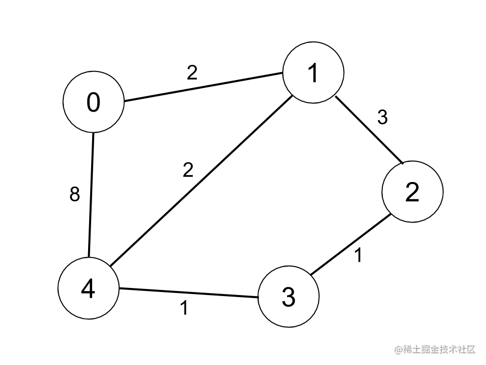 输入: n = 5, edges = [[0,1,2],[0,4,8],[1,2,3],[1,4,2],[2,3,1],[3,4,1]], distanceThreshold = 2