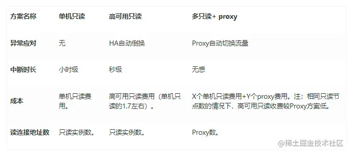 除高可用只读方案外,多只读实例Proxy轮询的方案也有相同效果。即购买多个只读实例,并开启数据库代理(proxy)的方案,在发生异常情况时,数据库代理自动把流量切换到其他正常只读实例,从而避免出现业务中断发生。Proxy方案架构图如下:单机只读、高可用只读、多只读+ proxy,在应用并发连接数、异常反应、成本方面的对比如下: