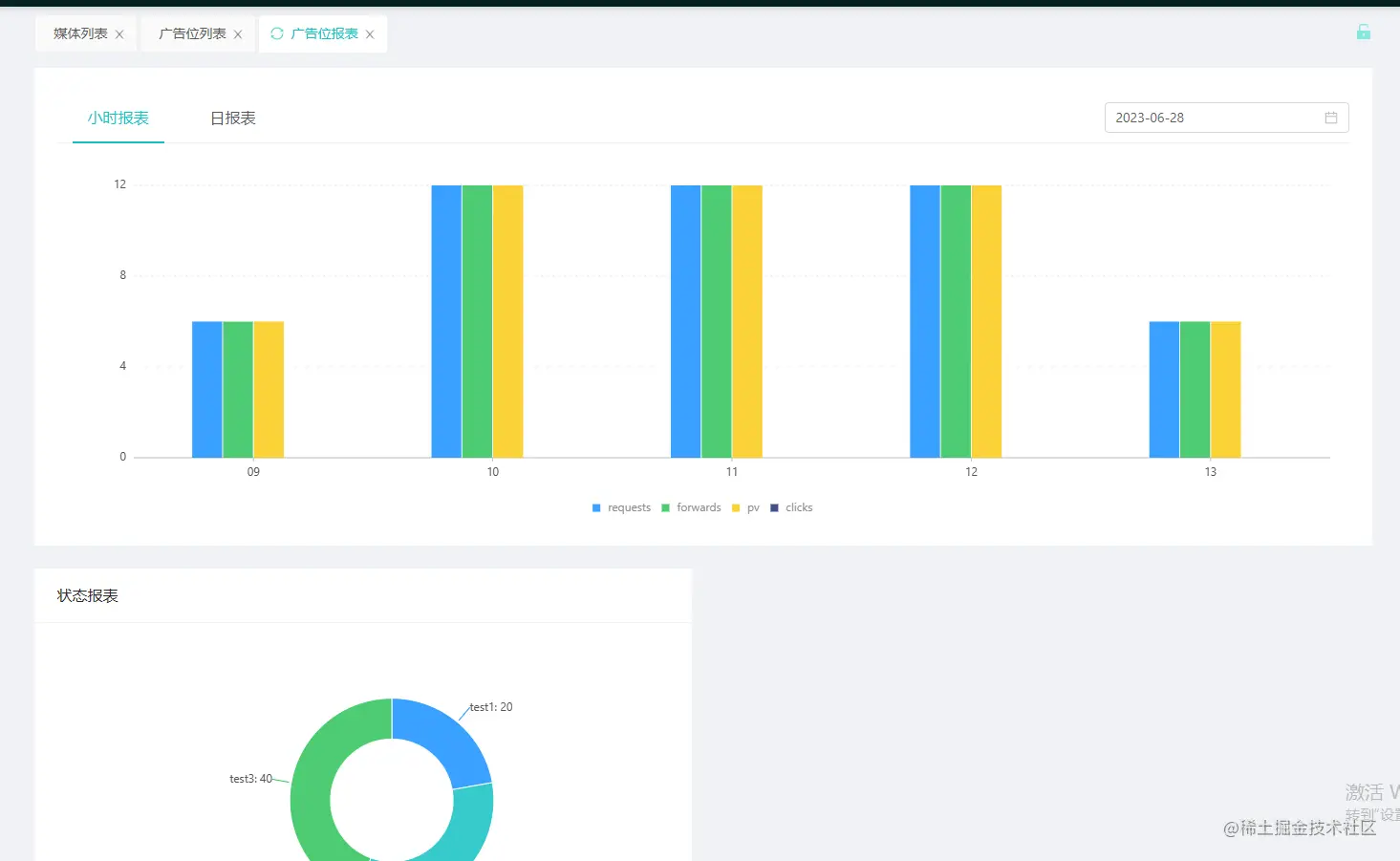 报表有一点特殊,使用的阿里的G2引擎。G2图表,项目中使用的是viser,一个非常好用丰富的图表库。可以根据自己的业务需要进行绘制对应的数据即可。Viser图表。成品如下: