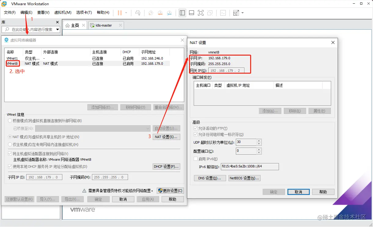 查看虚拟网卡网络信息: 编辑 → 虚拟网络编辑器→选中VMnet8虚拟网卡→点击NAT设置 查看 子网IP、子网掩码和 网关IP