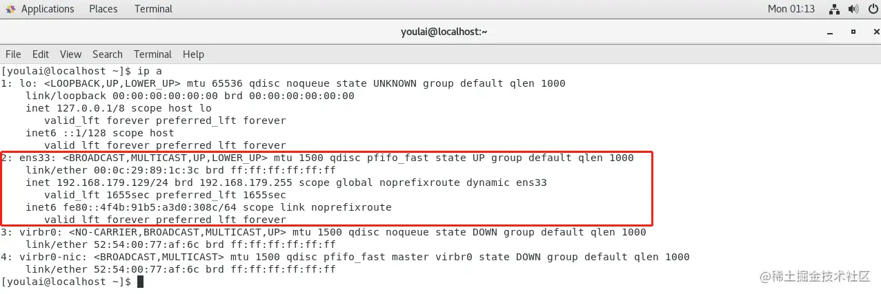 登入虚拟机,终端 Terminal 输入命令 ip a 查看网卡信息