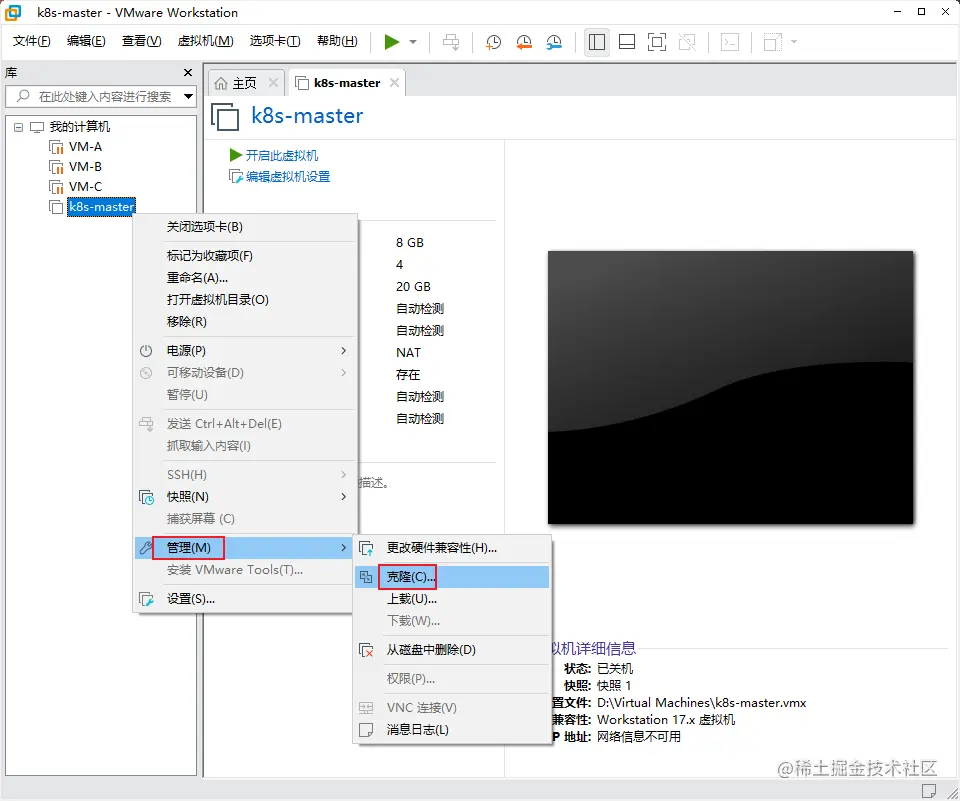 鼠标右单击上文创建好的虚拟机 → 管理 → 克隆