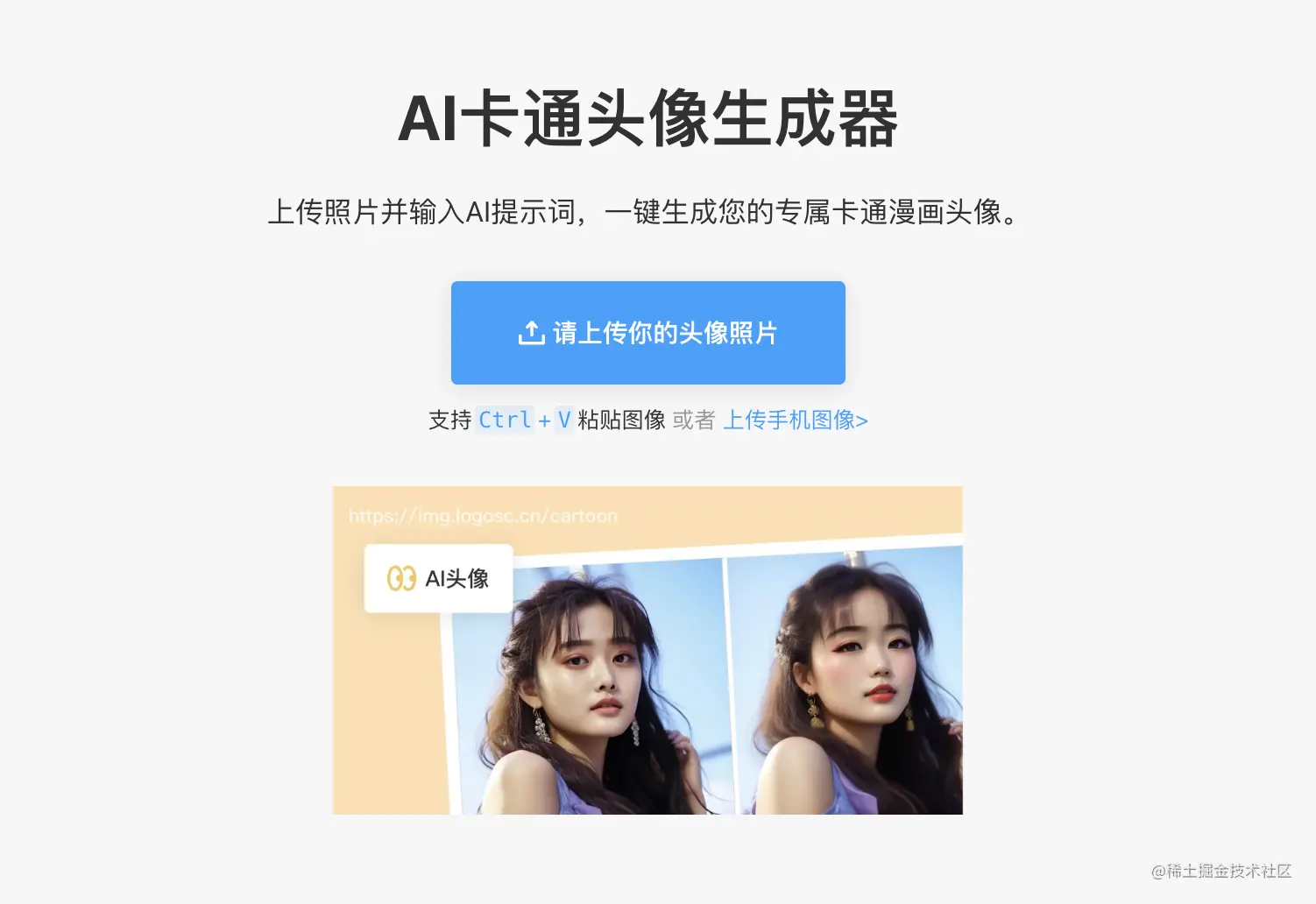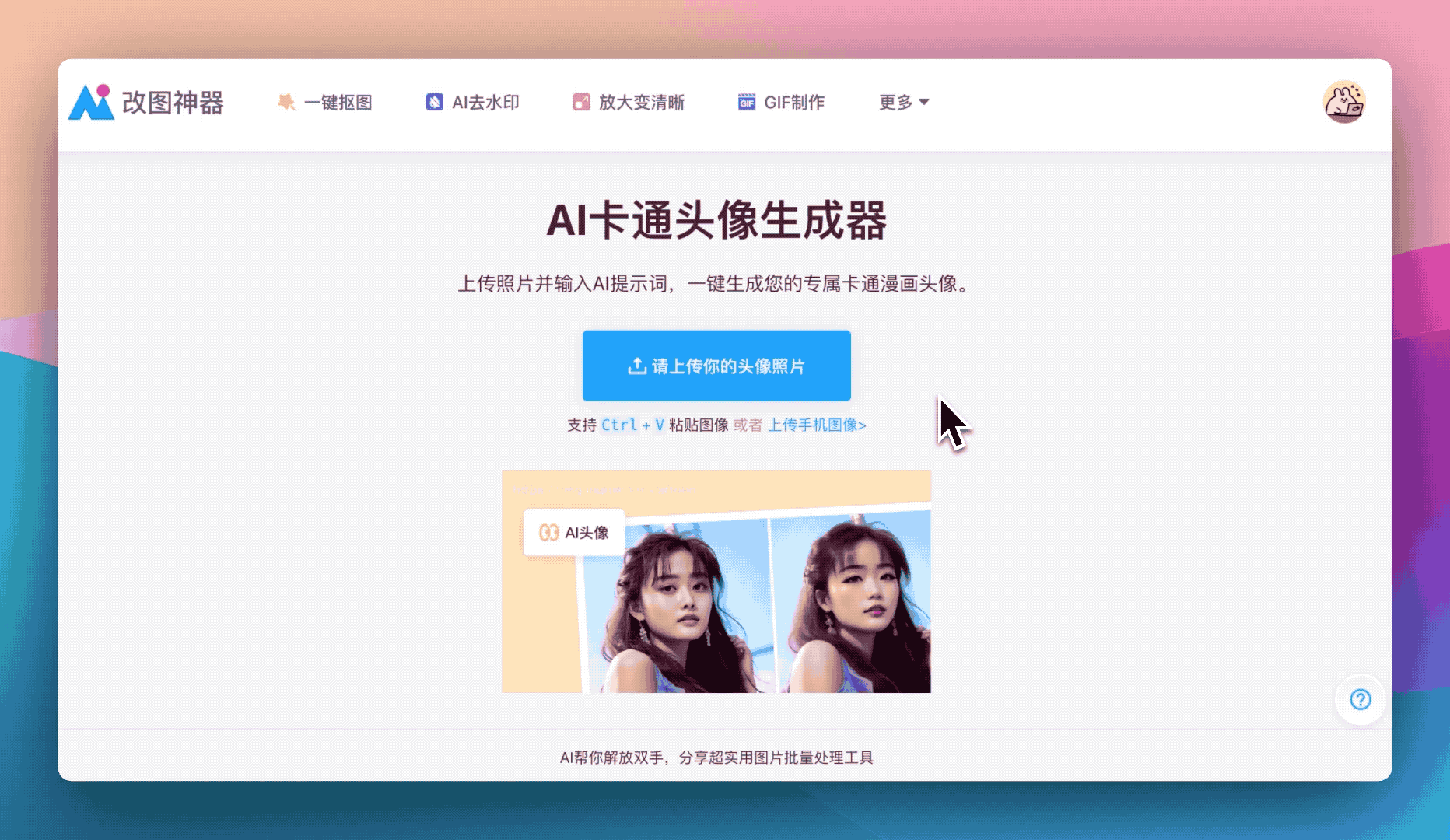 生成卡通头像的操作非常简单,只需要点击进入AI改图神器的AI头像功能界面,拖拽你想要生成卡通头像的照片到网页上或者点击上传,也支持使用 Ctrl+V 将照片复制进来,或者可以从手机端直接扫码上传图片到电脑端进行处理,最高支持20M大小的照片。