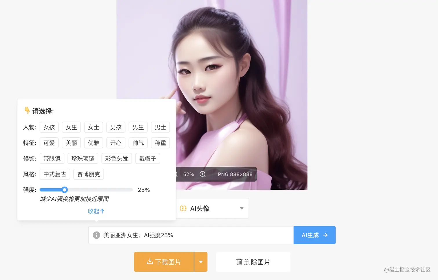 对于很多小伙伴们来说,AI绘画最难的部分就是写AI提示词了,不过使用AI改图神器就完全不需要担心这一点,上传图片完成后,选择词语填入输入框,AI就会生成相关指令填写在输入框中并且自动生成相应风格的头像,真正实现AI智能绘画!