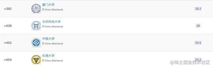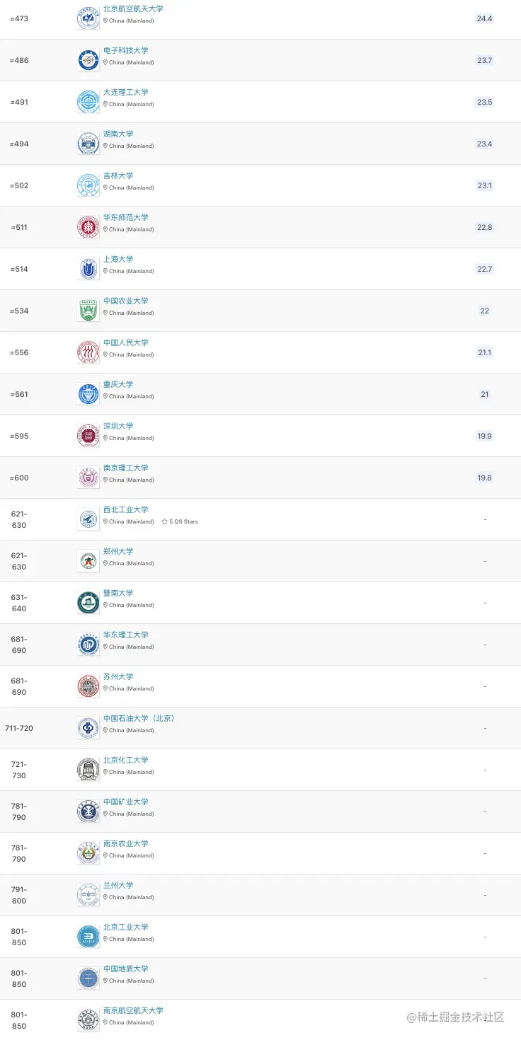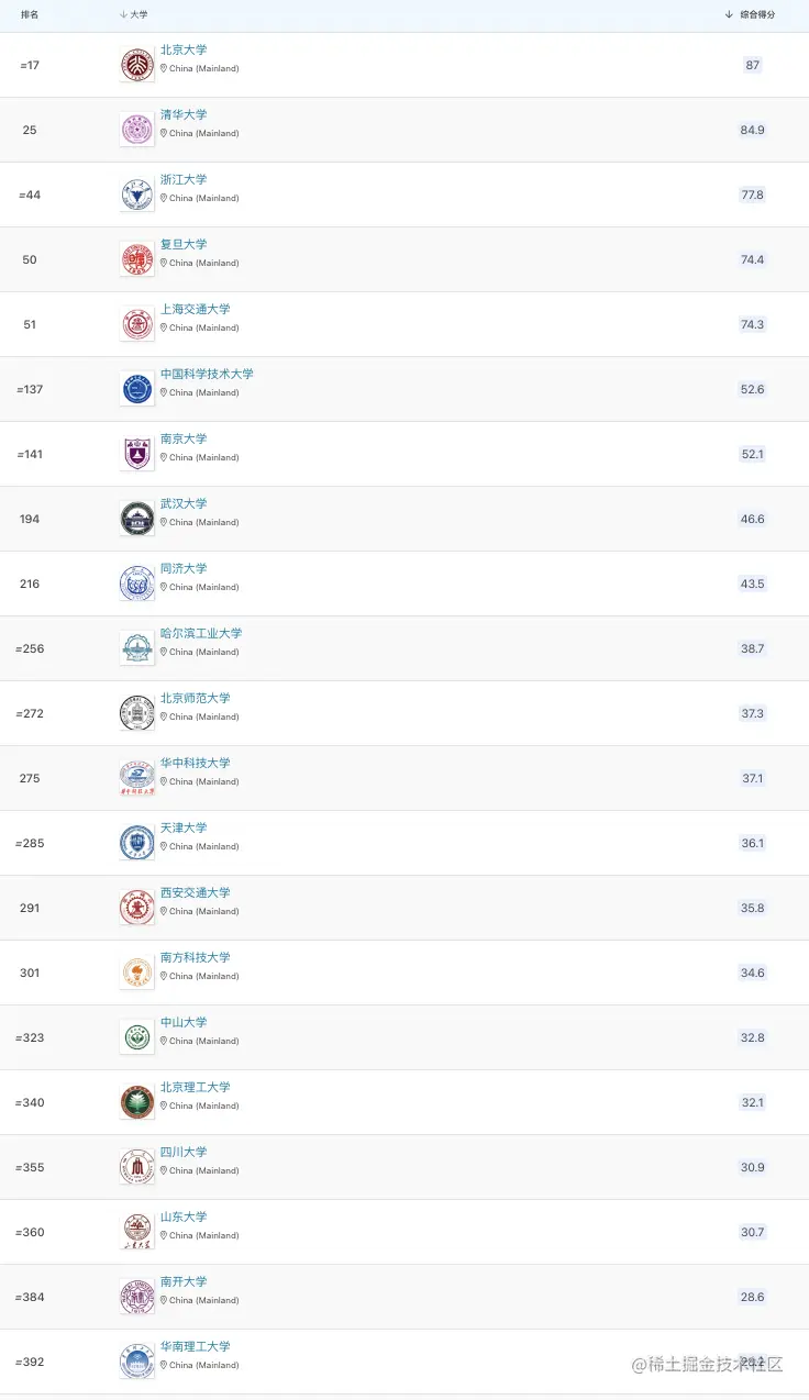 除清北外,还有很多大陆大学在本次排名中取得非常好的成绩:浙江大学 - 第44名,复旦大学 - 第50名,上海交通大学 - 第51名,中国科学技术大学 - 第137名,南京大学 - 第141名, 武汉大学 - 第194名,同济大学 - 第216名。