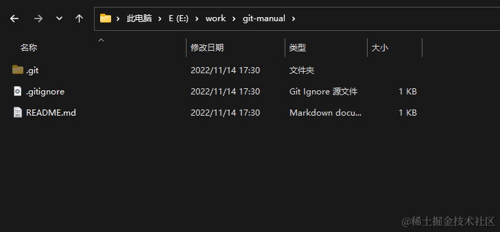 可以看到在.gitignore和README.md这两个文件之外,还有一个.git的隐藏文件夹。