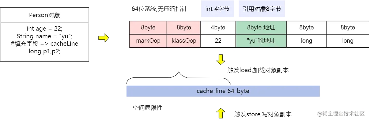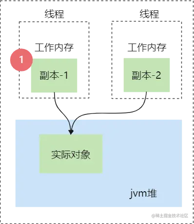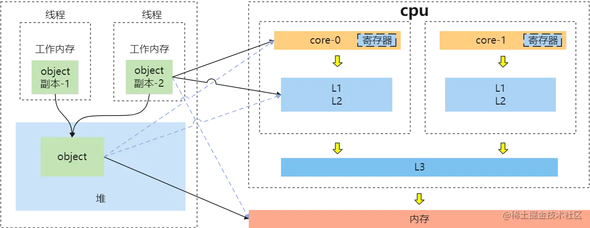 线程在获取对象时,实际上是当前的cpu从内存中加载此内存至寄存器(cache_line),当然加载的即为是实际对象的副本(copy);