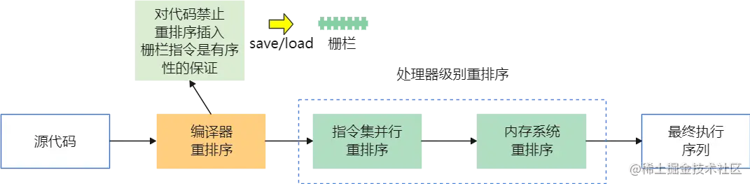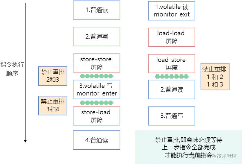 在执行指令时加入屏障(Barriers)指令,如针对Store-Load操作,强制cpu执行完成写(Store)的全部过程,才能执行读(Load)指令;