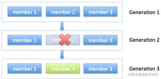 它表示了rebalance之后的一届成员,主要是用于保护consumer group,隔离无效offset提交的。比如上一届的consumer成员是无法提交位移到新一届的consumer group中。每次group进行rebalance之后,generation号都会加1,表示group进入到了一个新的版本,如下图所示: Generation 1时group有3个成员,随后成员2退出组,coordinator触发rebalance,consumer group进入Generation 2,之后成员4加入,再次触发rebalance,group进入Generation 3.