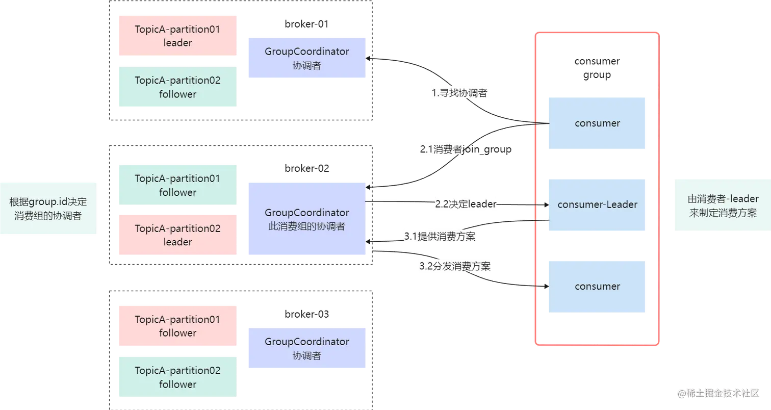 组协调器GroupCoordinator:每个consumer-group都会选择一个broker作为自己的组协调coordinator,负责监控消费组里的所有消费者的心跳,以及判断是否宕机,然后开启消费者rebalance。