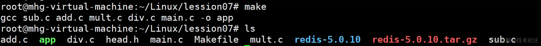 保存后返回,并输入make指令,可以看到,就自动执行了命令并生成了可执行文件app