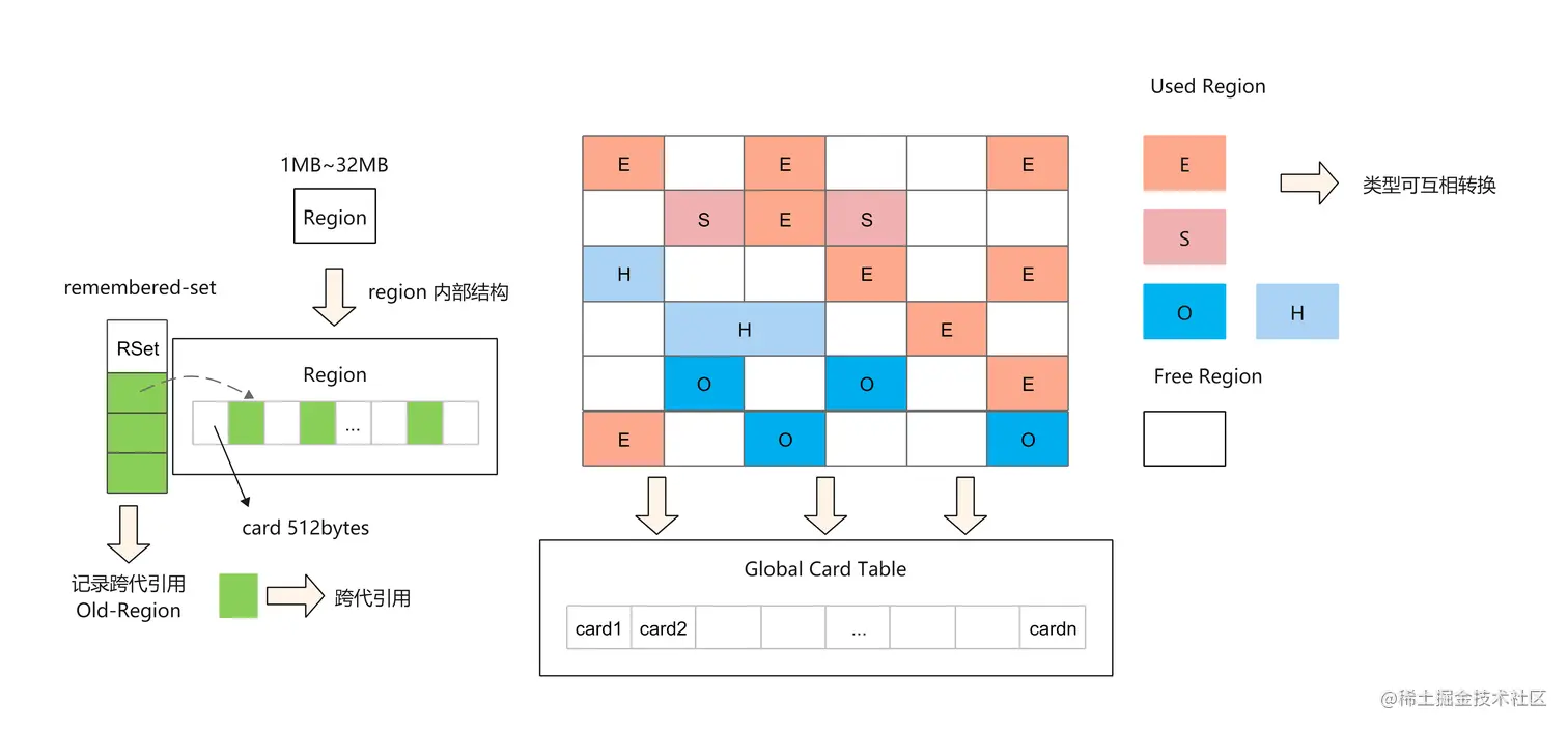 一个Region可能之前是年轻代,如果Region进行了垃圾回收,之后可能又会变成老年代,也就是说Region的区域功能可能会动态变化。