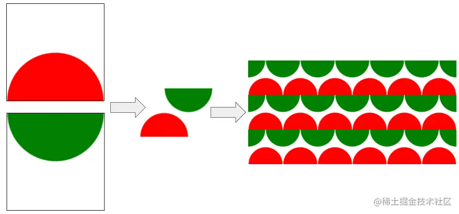 看上面的图并没有什么复杂的,我们只是重复循环画圆。圆、椭圆、半圆、四分之一圆等等我们都可以使用radial-gradient()