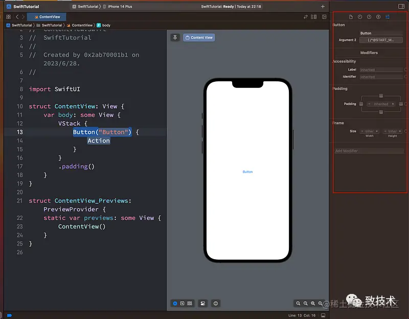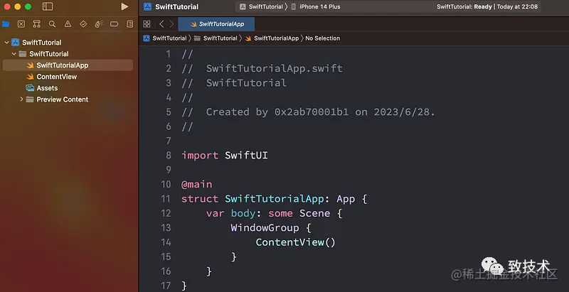 打开左侧 SwiftTutorialApp.swift 文件,可以看到一个 @main的英文,标识这个文件是项目启动的入口文件