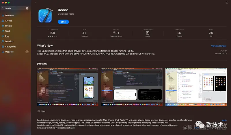 首先我们打开AppStore App,搜索Xcode,即可下载开发工具。AppStore App 是 macOS 系统自带的下载 app 的途径,这里面都是官方审核加密过的app,还是非常安全的。