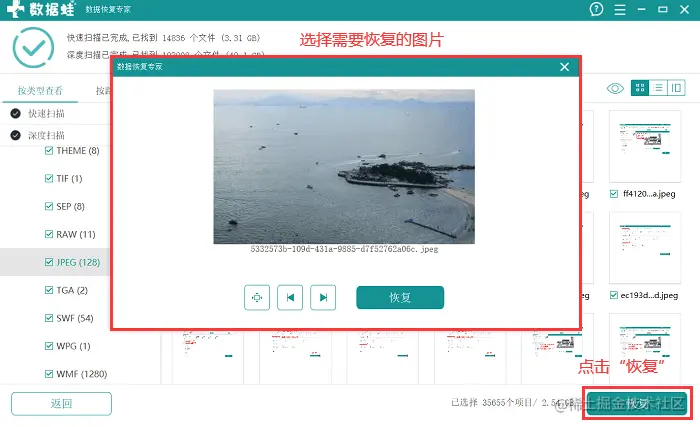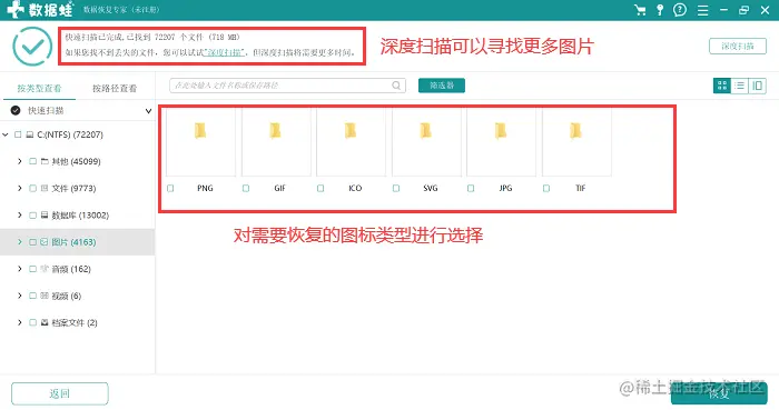 4.等待首次扫描完成,可以按类型对需要恢复的文件进行选择(若需恢复照片,直接找到图片的类型进行选择),所有需要恢复的文件选择完毕,点击 【恢复】 ,没有选择完毕,点击 【深度扫描】 ;