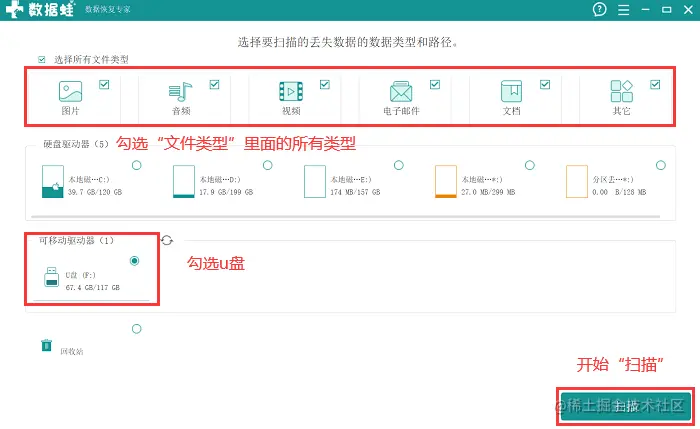 - 选择你需要恢复的文件(全选能得到更全面的扫描结果),并勾选【u盘】的盘符,点击【扫描】;