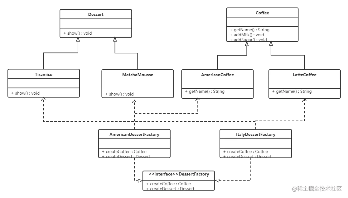 现咖啡店业务发生改变,不仅要生产咖啡还要生产甜点,如提拉米苏、抹茶慕斯等,要是按照工厂方法模式,需要定义提拉米苏类、抹茶慕斯类、提拉米苏工厂、抹茶慕斯工厂、甜点工厂类,很容易发生类爆炸情况。其中拿铁咖啡、美式咖啡是一个产品等级,都是咖啡;提拉米苏、抹茶慕斯也是一个产品等级;拿铁咖啡和提拉米苏是同一产品族(也就是都属于意大利风味),美式咖啡和抹茶慕斯是同一产品族(也就是都属于美式风味)。所以这个案例可以使用抽象工厂模式实现。类图如下: