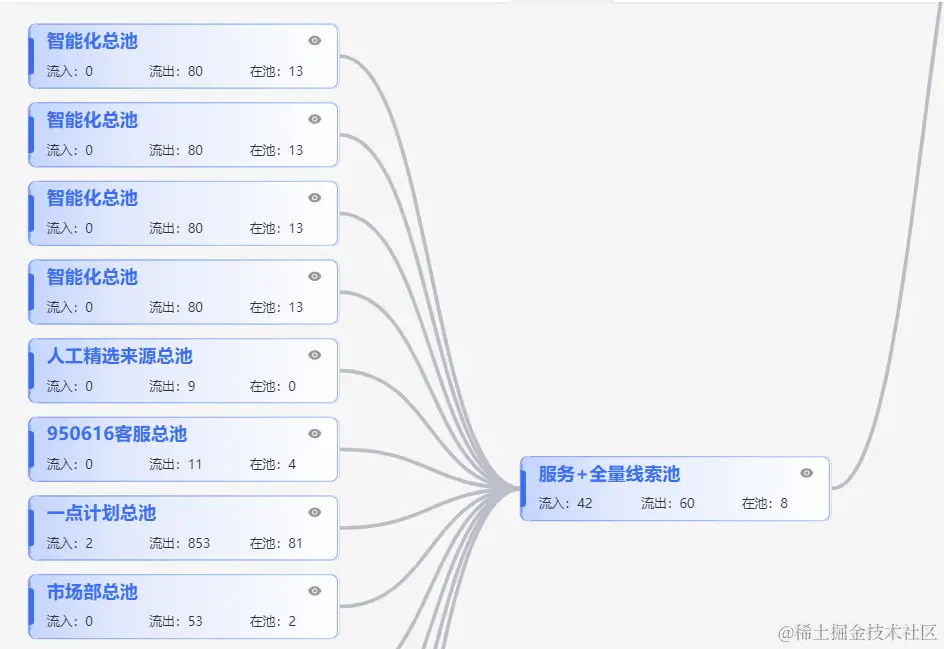 - 业务背景:CRM系统随着各业务条线对线索精细化分配的诉求逐渐增加,各个条线的流向规则会越来越复杂,各个条线甚至整个CRM的线索流转规则急需一种树形的可视化的图来表达。