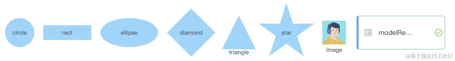 G6 的内置节点包括 circle,rect,ellipse,diamond,triangle,star,image,modelRect,donut(v4.2.5 起支持)。这些内置节点的默认样式分别如下图所示。