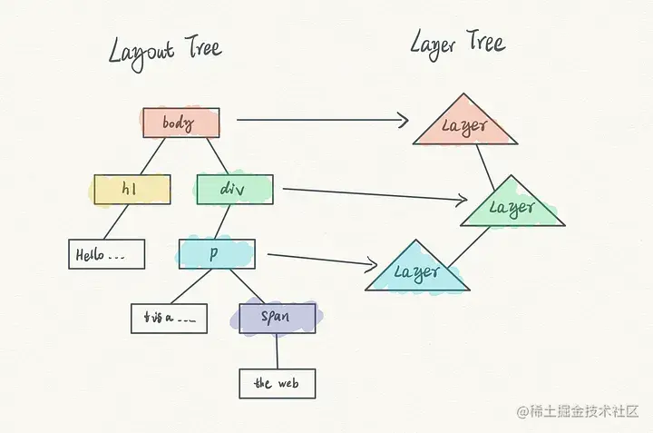 核心:为绘制顺序服务,特定的节点生成专用的图层,并非所有元素都有自己的图层。(参考 PhotoShop 图层)