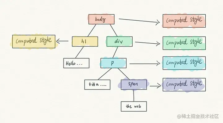 - 计算出 DOM 树中每个节点的具体样式 (涉及CSS 的继承规则和层叠规则。可以打开 devtool->element -> Styles 面板查看。)