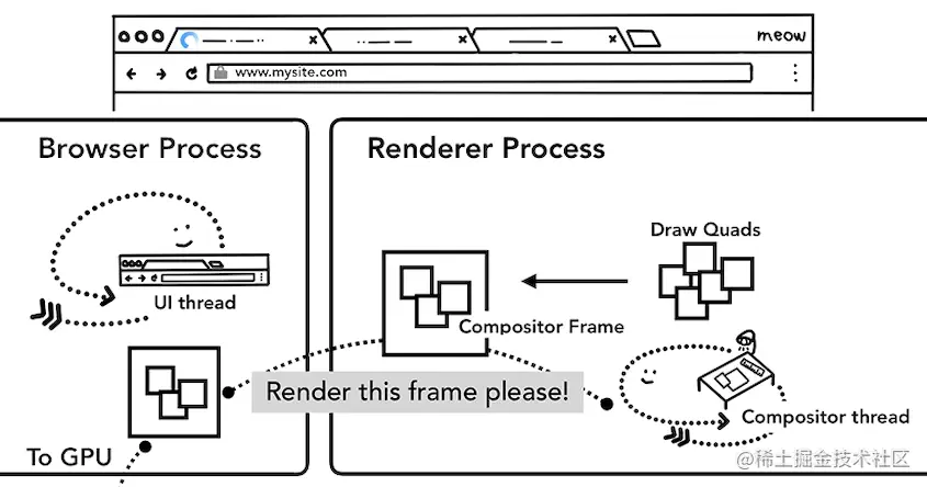 接着,合成器帧(Compositor frame)提交给浏览器进程。