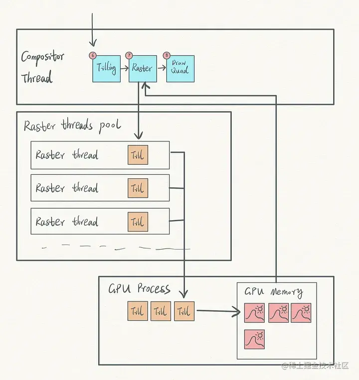 有了图块(tiles)后,合成器线程将创建一个栅格线程池。多个栅格线程同时进行栅格切片(并行)。