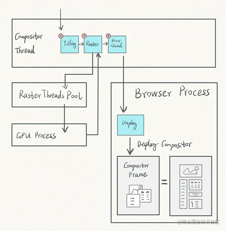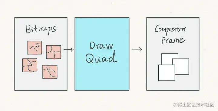 一旦所有图块都被光栅化,合成线程就会调用一个绘制图块的命令——“DrawQuad”,生成合成器帧(Compositor frame)。