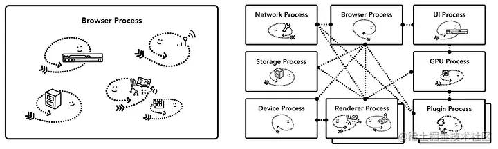 浏览器进程、网络进程、GPU 进程、渲染进程 (控制在 tab 里面展示的所有内容)