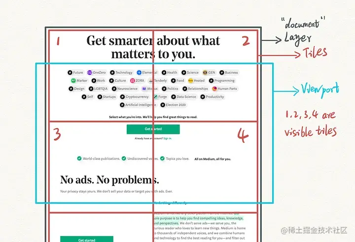 在有些情况下,有的图层可以很大,比如有的页面你使用滚动条要滚动好久才能滚动到底部,但是通过视口,用户只能看到页面的很小一部分,所以在这种情况下,要渲染出所有图层内容的话,就会产生太大的开销,而且也没有必要。