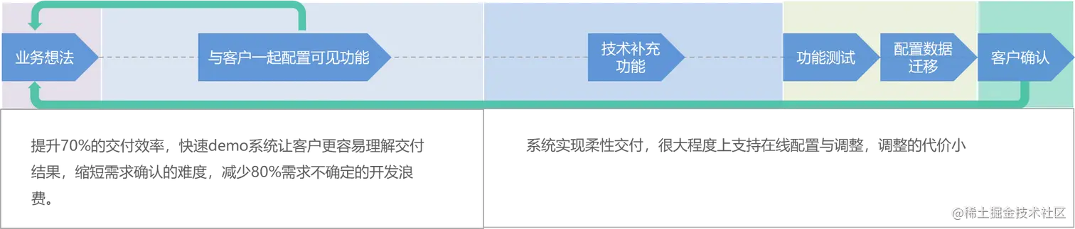 那么,我们再来看看低代码开发的流程,这里以JVS快速开发平台举例,低代码的交付模式如下图所示:
