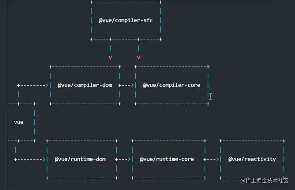 我们先看一下Vue3模块间关系的结构图,会发现Vue的核心部分其实不就是三个部分,compiler,runtime,reactivity这三个部分,前面已经完成了reactivity的讲解,接下来只需搞定compiler和runtime就行了