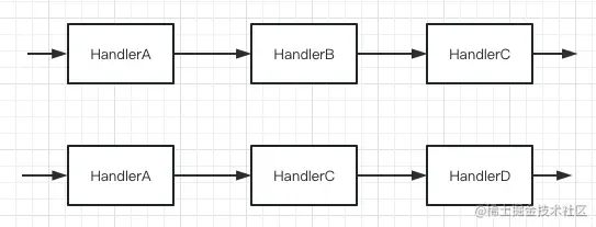 假设我们自定义了一套协议,其请求中包含 A、B、C 三个核心部分,业务系统使用 Handler A、Handler B、Handler C 三个处理器来处理这三部分的数据。如果业务变化导致我们的自定义协议也发生了变化,协议中的数据变成了 A、C、D 这三部分,那么我们只需要动态调整构成责任链的 Handler 处理器即可,最新的责任链变为 Handler A、Handler C、Handler D。如下图所示: