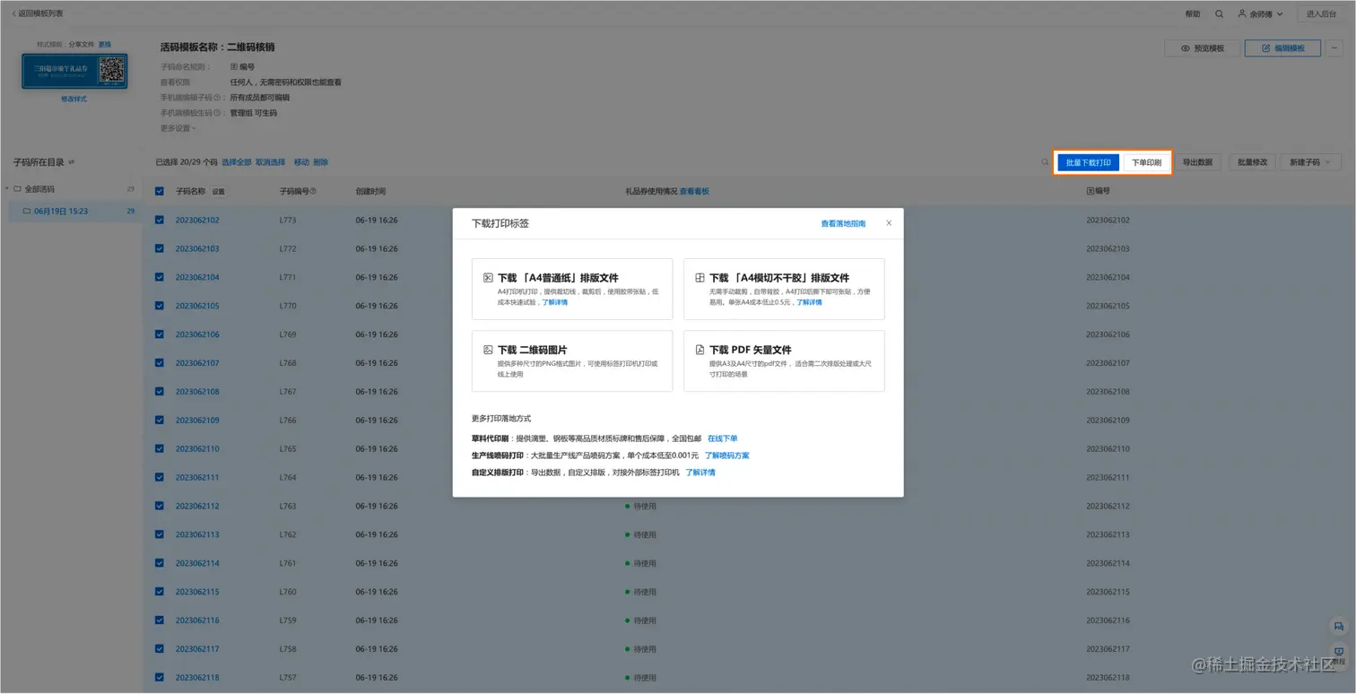 进入批量模板详情页,选择下载标签打印或者直接下单打印制作好的礼品券标签