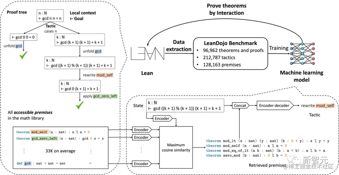 研究团队针对Lean进行了加工和改进,开发出了LeanDojo。它可以从Lean中提炼出人类撰写的证明过程,形成一个数据集。