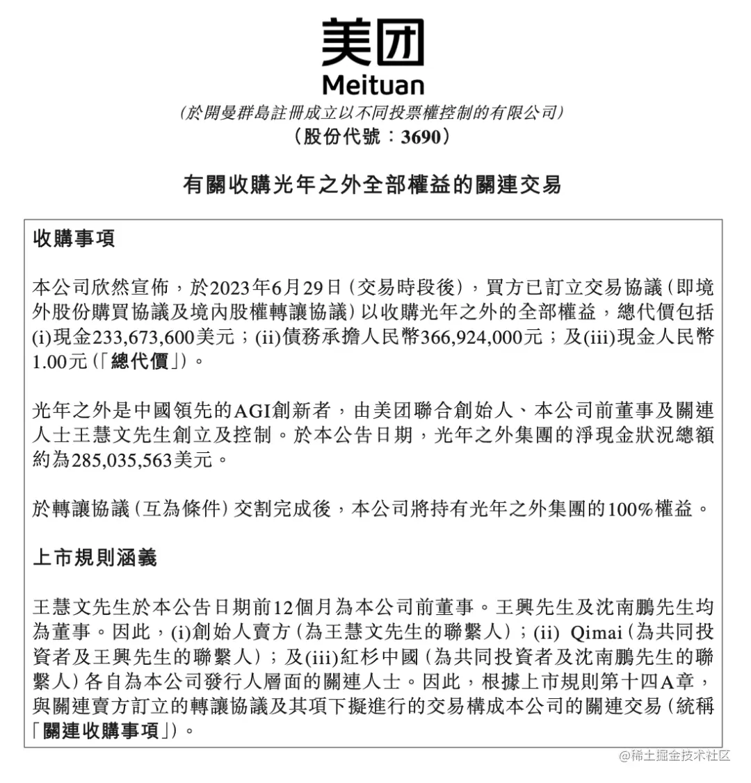 今天下午,美团于香港联交所发布公告,称已完成光年之外境内外主体 100% 股权的收购,收购价约为 20.65 亿人民币。