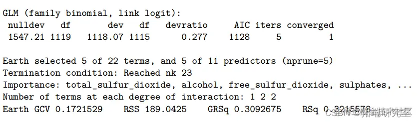 MARS 模型表明,在最大化 ROC 时,我们在 11 个预测变量中包含了 5 个项,其中 nprune 等于 5,度数为 2。这些预测变量和铰链函数总共解释了总方差的 32.2%。根据 MARS 输出,三个最重要的预测因子是总二氧化硫、酒精和硫酸盐。
